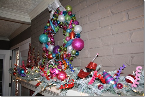 Last year I wrote about the mostly new decorations that my friend Jennifer and I prepared for her home. Here’s the link: Candy Colored Christmas. She asked me to style her house again and this time I repositioned the decorations a bit to keep it interesting. I created a new spray for the front door using these flat ornaments so she can actually close her storm door…it only allows for about 4” of space!