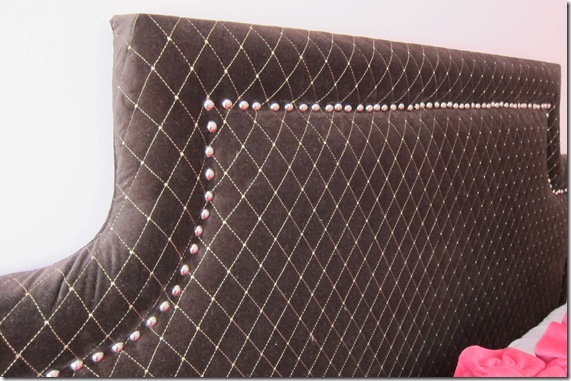 The first thing I constructed was her new headboard. I searched for a while to find the perfect quilted velvet in a deep chocolate.