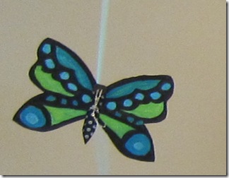 The Pandamania theme was darling and the setting in the big room was inside a bamboo forest with pandas. There were lots of huge butterflies floating and spinning overhead, a bamboo forest surrounding the area with Chinese paper umbrellas, flowers, vines and pandas. To make the huge butterflies, I cut out the shapes from butcher paper and painted them with acrylics. For the body, I did the same with butcher paper but hot glued a bottom to it, then stuffed it with paper to give a 3-d effect. I hot glued dowel rods on the back like a kite to keep the wingspan full so that the air conditioning vents would blow them about.