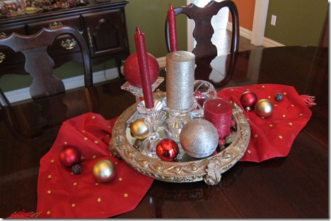 The dining table with lots of candles and crystal…another idea we both liked from Pinterest! The buffets hosts the rest of her rose bowl collection filled with red and gold ornaments, a garland with glitter and beaded balls in gold, orange-red and brown balls, gold runner and beautiful red and gold stripped ribbon to pull it all together.